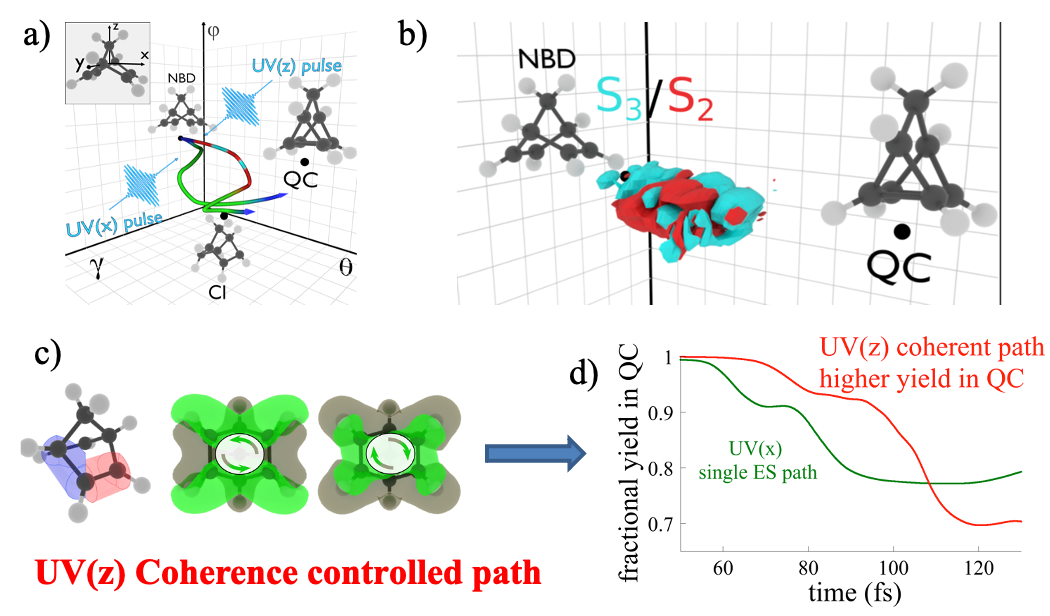Summary : Atto (1 as = 10−18 s) and few femtosecond (1 fs = 10−15 s) optical pulses allow exciting and probing electrons and nuclei in molecules on their intrinsic timescales. Their broad energy bandwidth of 0.5 to few eV leads to exciting selectively superpositions of several excited electronic states, building electronic coherences, which opens the way to shape the correlations between electronic and nuclear motions that are the heart of bond breaking and bond making at the excitation step. The main goal of MOLECOH is to develop a rational approach for designing control schemes of chemical reactivity that exploit photoexcited electronic coherences. Our aim is to design control schemes based on selectively exciting electronic coherences to control the correlation between electronic and nuclear motions on an ultrafast time scale before significant dephasing has occurred. Exciting specific coherences in molecules will be achieved by tuning the parameters of the attopulse: Its carrier frequency, duration, polarization and carrier envelope phase. Fully quantal dynamics for several coupled electronic states and few nuclear degrees of freedom will be implemented. On the fly semiclassical simulations in full dimensionality of the nuclear degrees of freedom will be used to identify those relevant nuclear coordinates that are essential for simulating the short time quantum dynamics. To enable a rational design of the control schemes, the entanglement of the vibronic wave packet will be quantified as a function of time, as well as the force it exerts on the nuclei.